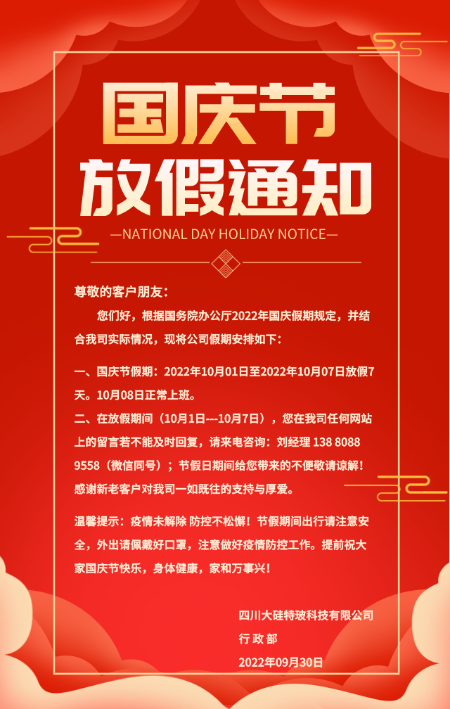 四川大硅特??萍紕⒖倲y公司全體員工提前祝大家國慶節快樂,生活幸福,身體健康,家和萬事興!